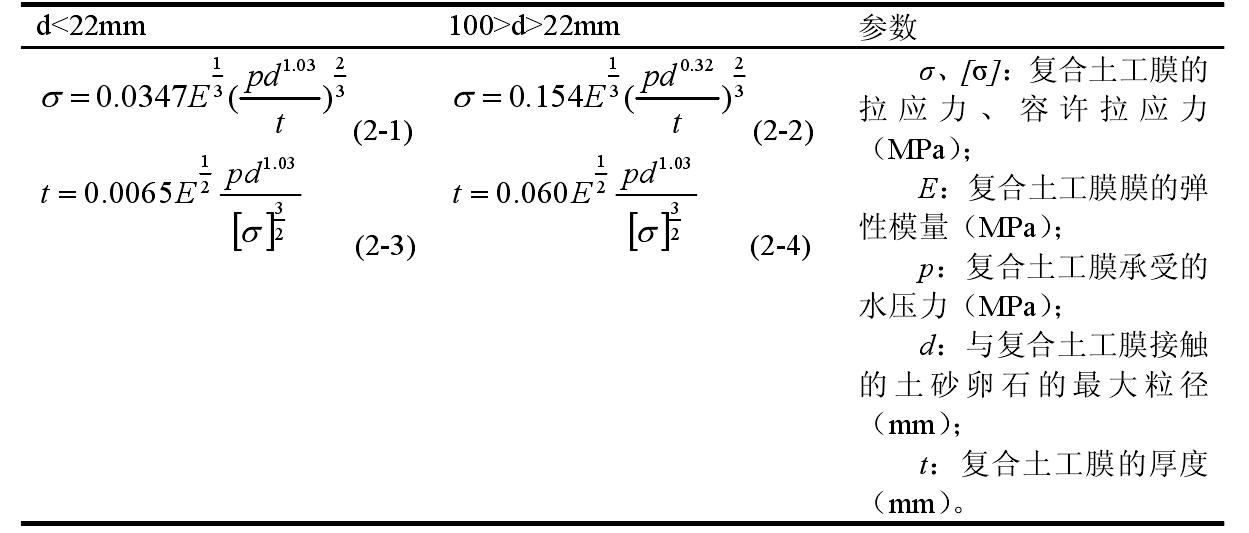 在初步选定防水91视频直播APP布材料的理论计算中,主要考虑了水压力对膜厚度的要求,在实际工况中,除了水压力外,会增加土压力、毛细水压力等不同力的综合作用,同时公式中选用的砂砾石为理想状态,假定不存在棱角和尖刺,实际工程中可能出现块石或有较尖边缘的回填料,在对膜厚度的选定时应留出较大的安全系数,技术规范中建议采用4至5倍的安全系数。