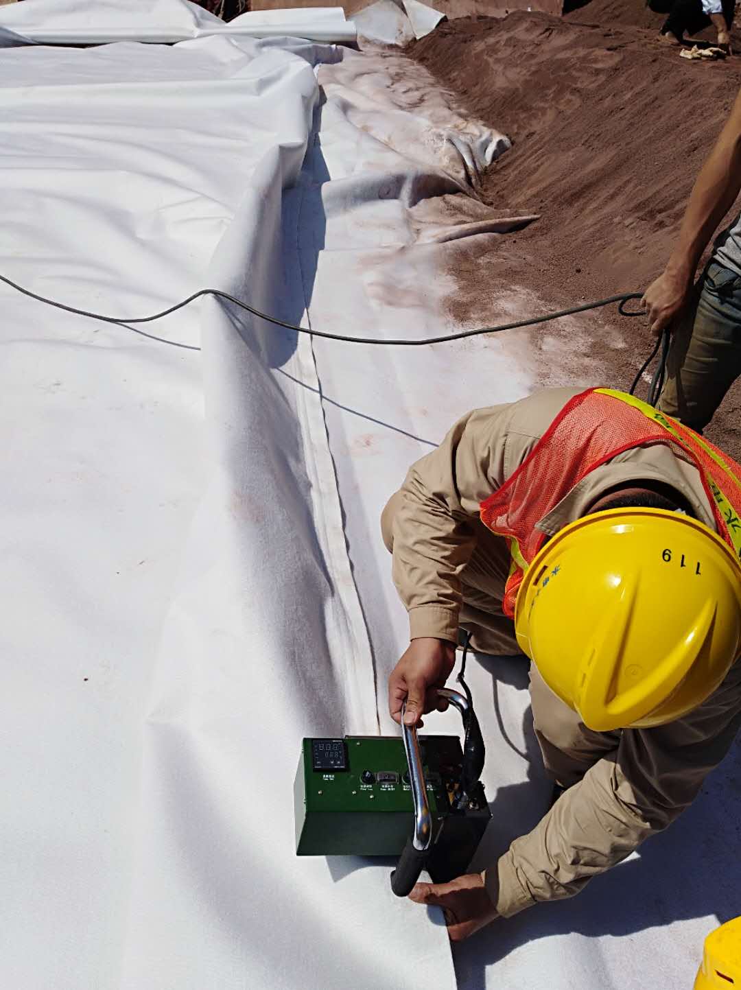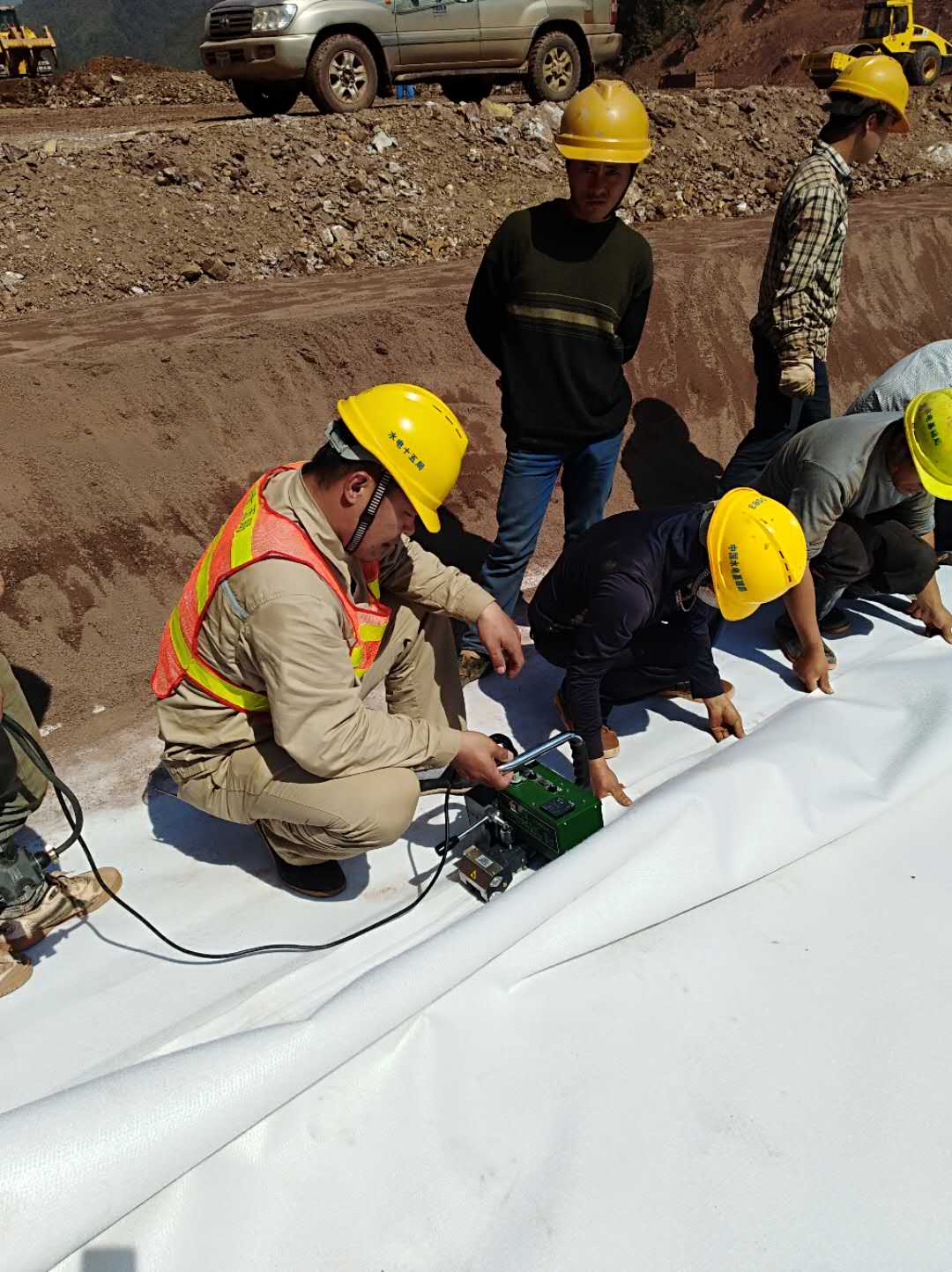 复合91视频直播APP膜铺设一般采用波浪形松弛铺设型式,富余度约为1.5%,随堤基填筑时协调施工,对于复合91视频直播APP膜上下面侧的填料严格控制粒径组成,一般采用粘土,不允许内含尖角碎石或块石,以防刺破膜体。摊开后及时拉平%拉开,要求复合91视频直播APP膜与坡面吻合平整,无突起褶皱,施工人员应穿平底布鞋或软胶鞋,严禁穿钉鞋,以免踩坏91视频直播APP膜,施工时如发现91视频直播APP膜损坏,应及时修补。复合91视频直播APP膜一次粘接长度控制在50m左右,以便于人工搬运、铺设,加工好的复合91视频直播APP膜沿防渗墙轴线方向卷成卷存放,以便于施工,减少作业场地。